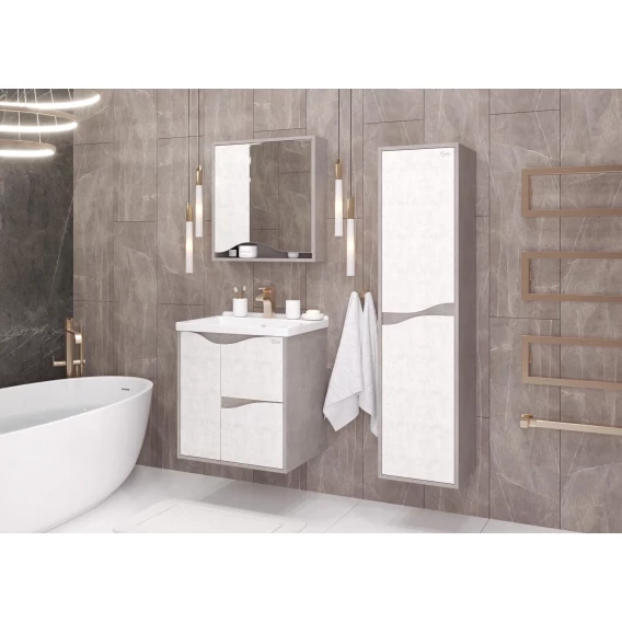 Подвесная тумба для ванной комнаты Onika Брендон 60 поможет создать особенную атмосферу ванной комнаты: текстуры камня и бетона гармонично дополняют друг-друга, создавая сдержанный выразительный акцент в интерьере.Тумба имеет два ящика, снабженные системой плавного закрывания: нижний предназначен для больших предметов, а верхний, имеющий удобную систему организации пространства, - для мелких аксессуаров. Слева от ящиков - распашная дверца с доводчиком, скрывающиая пространство, разделенное съемной полочкой. Ручки, изящно интегрированные в фасады, позволяют сделать эксплуатацию мебели более удобной и практичной.Корпус тумбы выполнен из ЛДСП, фасады ящиков - из ЛМДФ в пленке, устойчивых к механическим воздействиям, перепадам температур и высокой влажности, при этом тумба надежно крепится к стене и не занимает место на полу, не создавая при этом сложностей в уборке помещения.Подвесы для крепления тумбы - в комплекте.