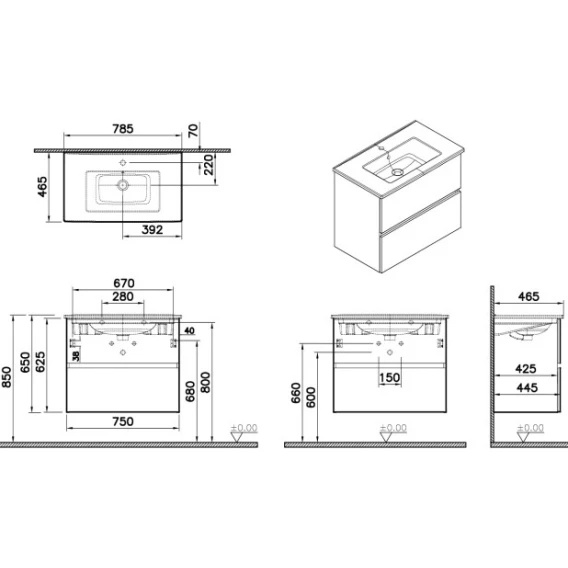 Тумба с раковиной VitrA Mia Plus Square 69742 78,5 см, подвесная, белый глянец