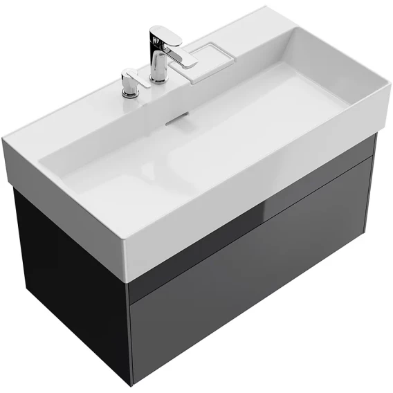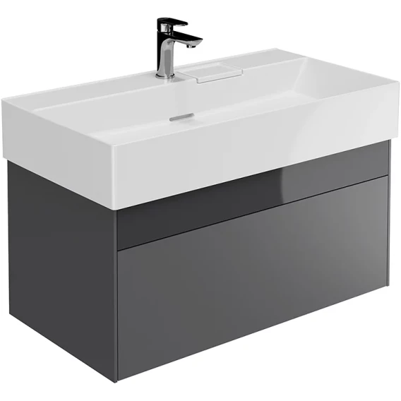 Фасады и корпус выполнены из МДФ в цвете «Стальной серый»: верхний фасад — глянцевый, нижний фасад и корпус — матовые. Тумба имеет два выдвижных ящика с открытием Push to open, с внутренней отделкой «Лён Антрацит». Верхний ящик, благодаря нестандартному расположению сифона, содержит больше полезного пространства и удивляет стеклянной вставкой в основании: через такое «окно» снизу струится свет, эффектно подчёркивая содержимое.