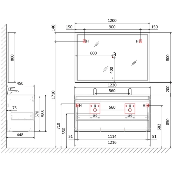 Комплект мебели белый/дуб 122 см Jorno Glass Gla.01.122/P/W + Mol.08.120/W + Gla.02.120/W