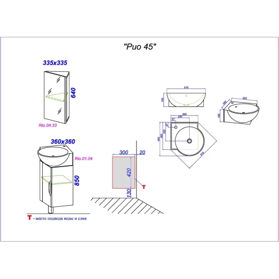 Комплект мебели белый глянец 45x45 см Aqwella Rio Rio.01.04 + 4640021061435 + Rio.04.33
