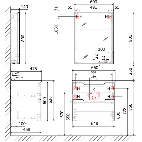 Комплект мебели белый 66 см Jorno Slide Sli.01.65/P/W + 4640021062203 + Sli.03.60/W