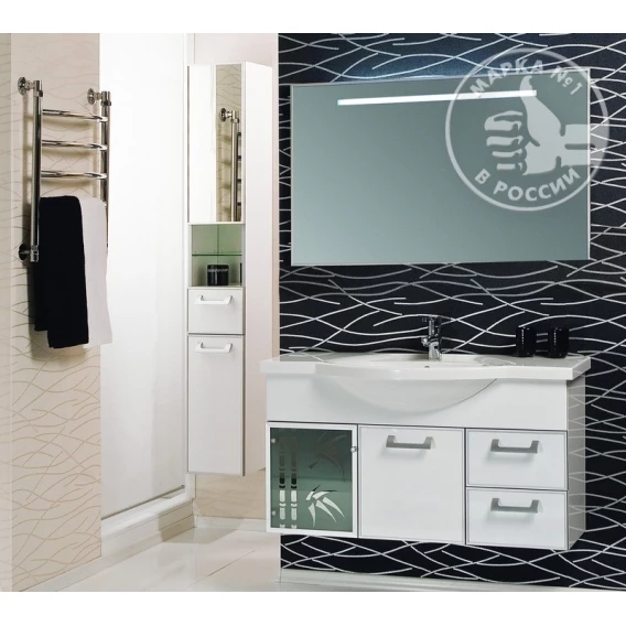 В тумбе, за большими створками тумбы расположена полка, а справа – два ящика. Левый фасад украшен стеклом с зеркальным рисунком в виде бамбука.