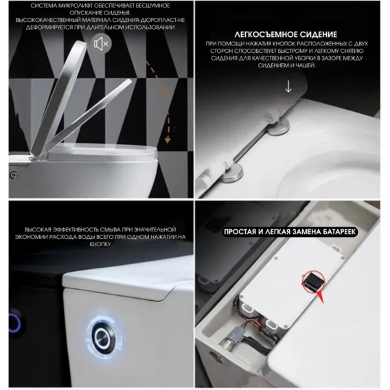 • 2 кнопки управления смывом: сбоку справа для нажатия рукой, а также спереди снизу для нажатия ногой