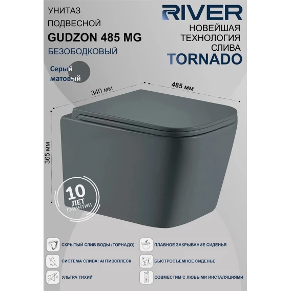 Унитаз подвесной River Gudzon 485 MG 10000013704 безободковый, торнадо, с сиденьем микролифт, серый матовый