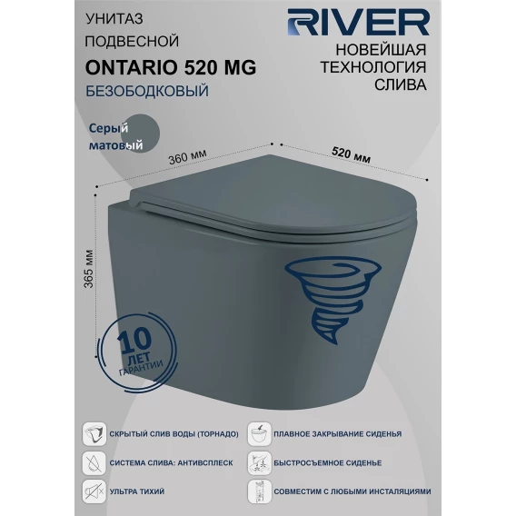 Унитаз подвесной River Ontario 520 MG 10000013710 безободковый, торнадо, с сиденьем микролифт, серый матовый