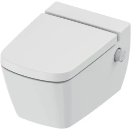 Подвесной безободковый унитаз со встроенным гигиеническим душем. Гигиенический душ функционирует без использования электричества, необходимо подключение к горячей и холодной воде.