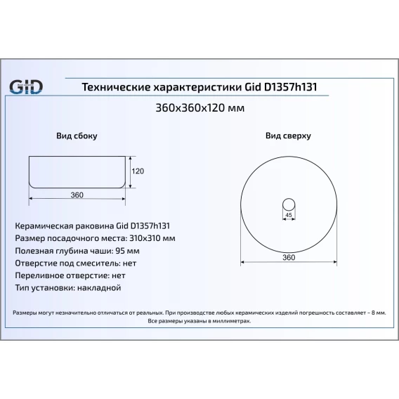 Раковина 42,5x42,5 см GID LuxeLine D1301h021