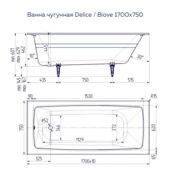 Ванна чугунная Delice Biove DLR220509RB 170x75 см, с ручками, белый