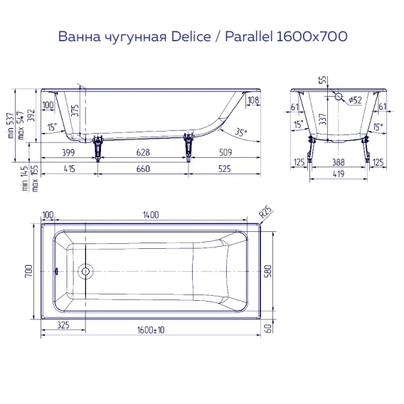 Ванна чугунная Delice Parallel DLR220504RB 160x70 см, с ручками, белый