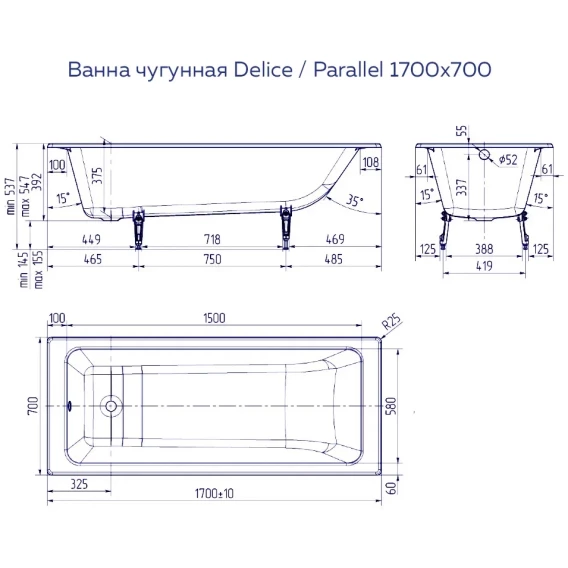 Ванна чугунная Delice Parallel DLR220505R 170x70 см, с ручками, белый