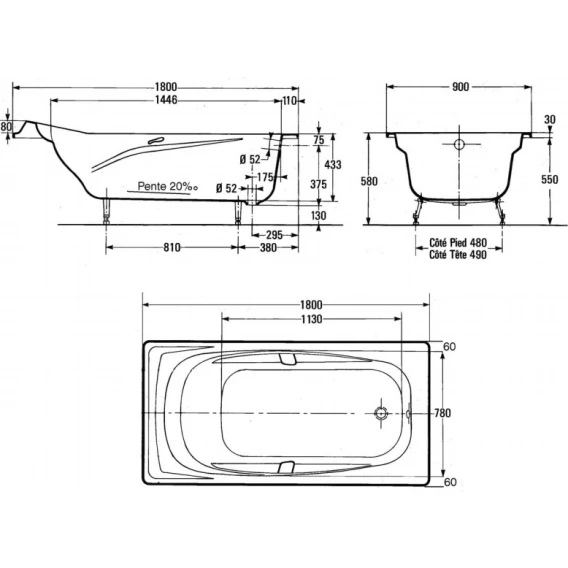 Ванна чугунная Jacob Delafon Super Repos E2902-00 180x90 см, с отверстиями под ручки, антискользящим покрытием, белый