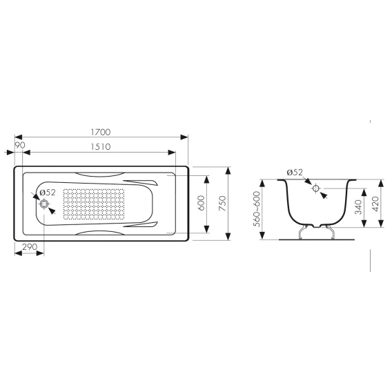 Ванна чугунная Kaiser KB-1704 170x75 см, с антискользящим покрытием, белый