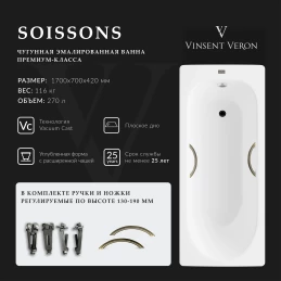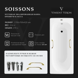 Ванна чугунная Vinsent Veron Aura VAU1707042H/VH0015BR 170x70 см, с ручками, белый