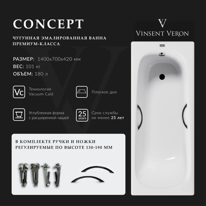 Ванна чугунная Vinsent Veron Concept VCO1657042 165x70 см, белый