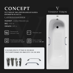 Ванна чугунная Vinsent Veron Concept VCO1507042H/VH0012CH-AS 150x70 см, с ручками, антискользящим покрытием, белый