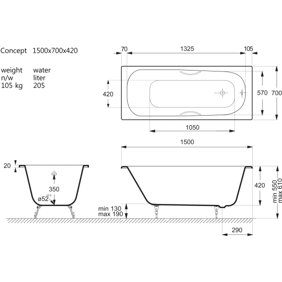 Ванна чугунная Vinsent Veron Concept VCO1507042H/VH0015BL 150x70 см, с ручками, белый