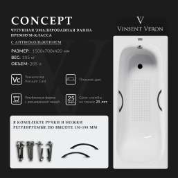 Ванна чугунная Vinsent Veron Concept VCO1507042H/VH0015BL-AS 150x70 см, с ручками, антискользящим покрытием, белый