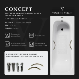 Ванна чугунная Vinsent Veron Concept VCO1507042H/VH0015BR-AS 150x70 см, с ручками, антискользящим покрытием, белый