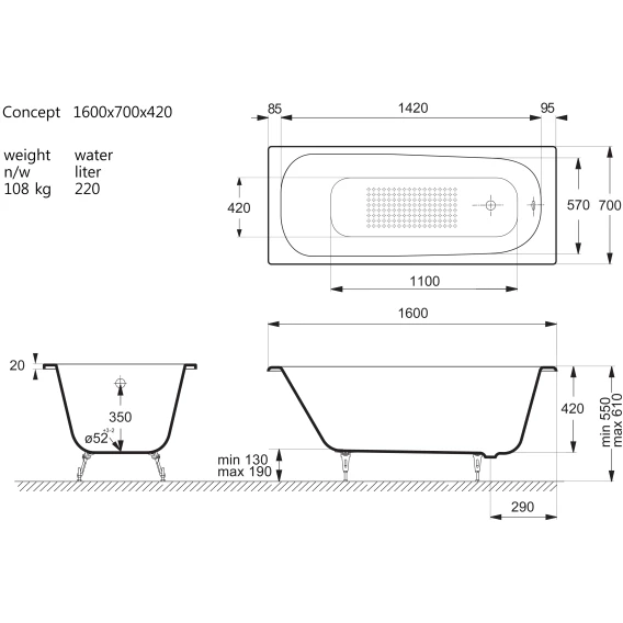 Ванна чугунная Vinsent Veron Concept VCO1507042H/VH0012BR 150x70 см, с ручками, белый
