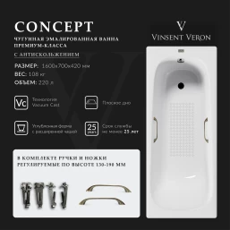 Ванна чугунная Vinsent Veron Concept VCO1607042H/VH0012BR-AS 160x70 см, с ручками, антискользящим покрытием, белый