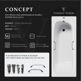 Ванна чугунная Vinsent Veron Concept VCO1607042H/VH0012CH 160x70 см, с ручками, белый