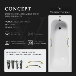 Ванна чугунная Vinsent Veron Concept VCO1607042H/VH0012GD 160x70 см, с ручками, белый
