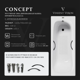 Ванна чугунная Vinsent Veron Concept VCO1607042H/VH0015BL-AS 160x70 см, с ручками, антискользящим покрытием, белый