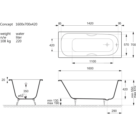 Ванна чугунная Vinsent Veron Concept VCO1507042H/VH0012BR 150x70 см, с ручками, белый