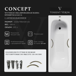 Ванна чугунная Vinsent Veron Concept VCO1607042H/VH0015BR-AS 160x70 см, с ручками, антискользящим покрытием, белый