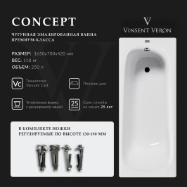 Ванна чугунная Vinsent Veron Concept VCO1657042 165x70 см, белый