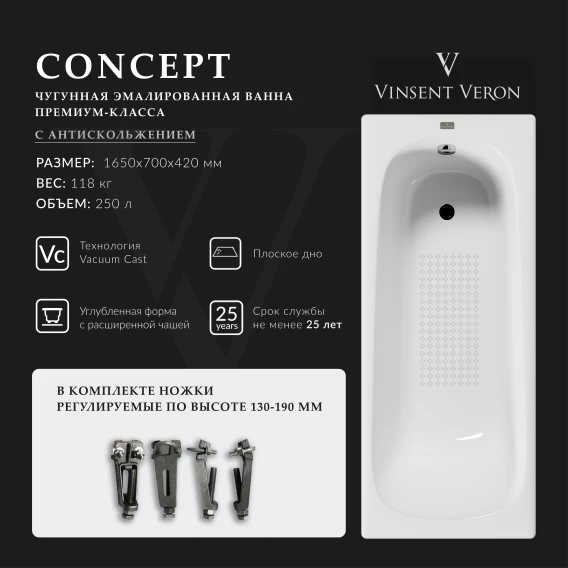 Ванна чугунная Vinsent Veron Concept VCO1657042-AS 165x70 см, с антискользящим покрытием, белый