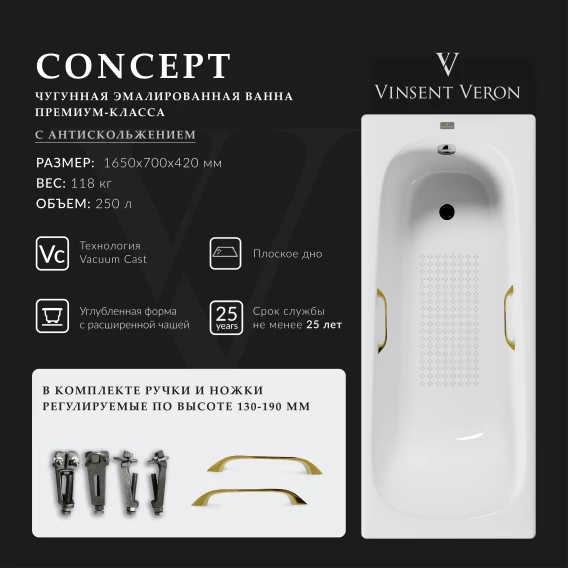 Ванна чугунная Vinsent Veron Concept VCO1657042H/VH0012GD-AS 165x70 см, с ручками, антискользящим покрытием, белый