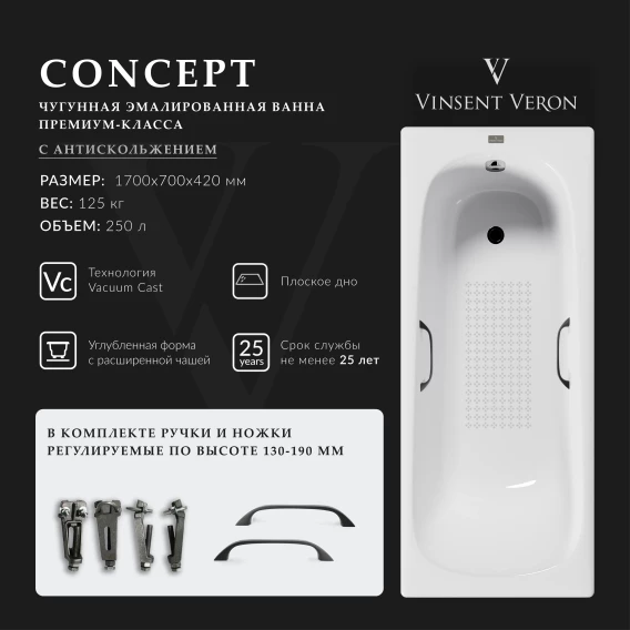 Ванна чугунная Vinsent Veron Concept VCO1707042H/VH0012BL-AS 170x70 см, с ручками, антискользящим покрытием, белый