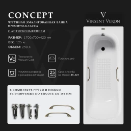 Ванна чугунная Vinsent Veron Concept VCO1707042H/VH0012BR-AS 170x70 см, с ручками, антискользящим покрытием, белый