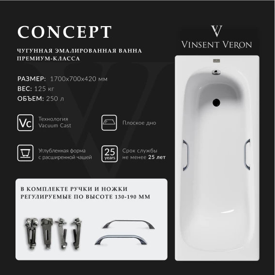 Ванна чугунная Vinsent Veron Concept VCO1707042H/VH0012CH 170x70 см, с ручками, белый