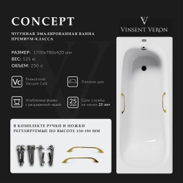 Ванна чугунная Vinsent Veron Concept VCO1707042H/VH0012GD 170x70 см, с ручками, белый