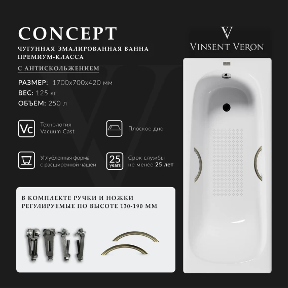 Ванна чугунная Vinsent Veron Concept VCO1707042H/VH0015BR-AS 170x70 см, с ручками, антискользящим покрытием, белый