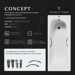 Ванна чугунная Vinsent Veron Concept VCO1707042H/VH0015CH-AS 170x70 см, с ручками, антискользящим покрытием, белый