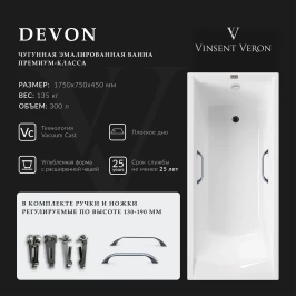 Ванна чугунная Vinsent Veron Devon VDV1757545H/VH0012CH 175x75 см, с ручками, белый