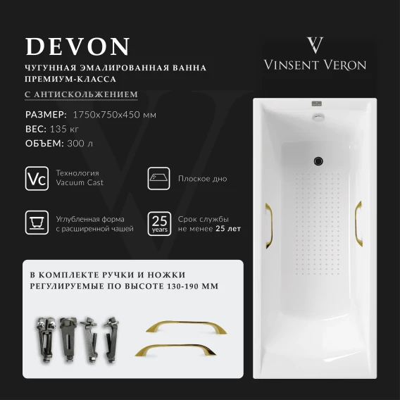 Ванна чугунная Vinsent Veron Devon VDV1757545H/VH0012GD-AS 175x75 см,с ручками, антискользящим покрытием, белый