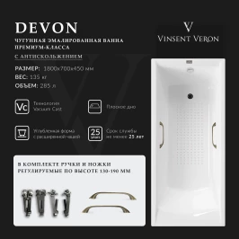 Ванна чугунная Vinsent Veron Devon VDV1807045H/VH0012BR-AS 180x70 см, с ручками, антискользящим покрытием, белый