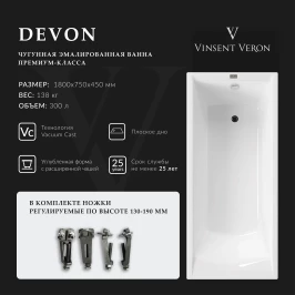 Ванна чугунная Vinsent Veron Devon VDV1807545 180x75 см, белый