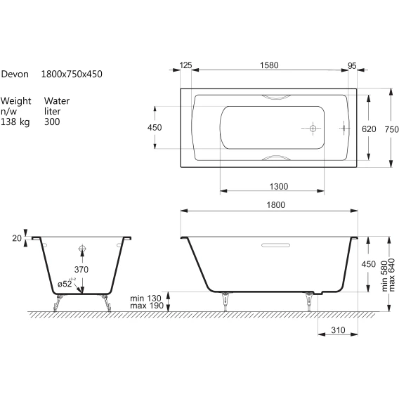 Ванна чугунная Vinsent Veron Devon VDV1807545H/E60327CH 180x75 см, с ручками, белый
