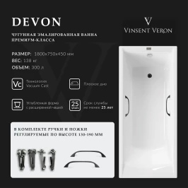 Ванна чугунная Vinsent Veron Devon VDV1807545H/VH0012BL 180x75 см, с ручками, белый