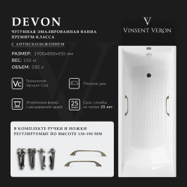 Ванна чугунная Vinsent Veron Devon VDV1908045H/VH0012BR-AS 190x80 см, с ручками, антискользящим покрытием, белый
