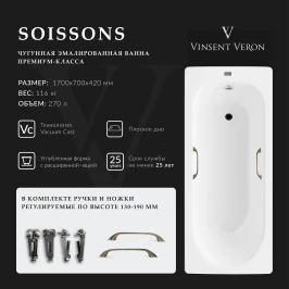 Ванна чугунная Vinsent Veron Soissons VCN1707042H/VH0012BR 170x70 см, с ручками, белый
