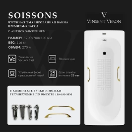 Ванна чугунная Vinsent Veron Soissons VCN1707042H/VH0012GD-AS 170x70 см, с ручками, антискользящим покрытием, белый
