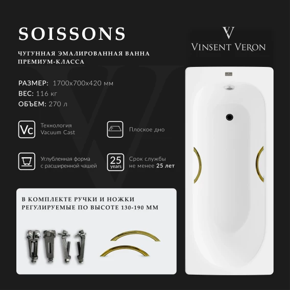 Ванна чугунная Vinsent Veron Soissons VCN1707042H/VH0015GD 170x70 см, с ручками, белый