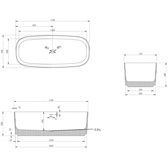 Ванна из литьевого мрамора Abber Stein AS9601 170x75 см, отдельностоящая, белый